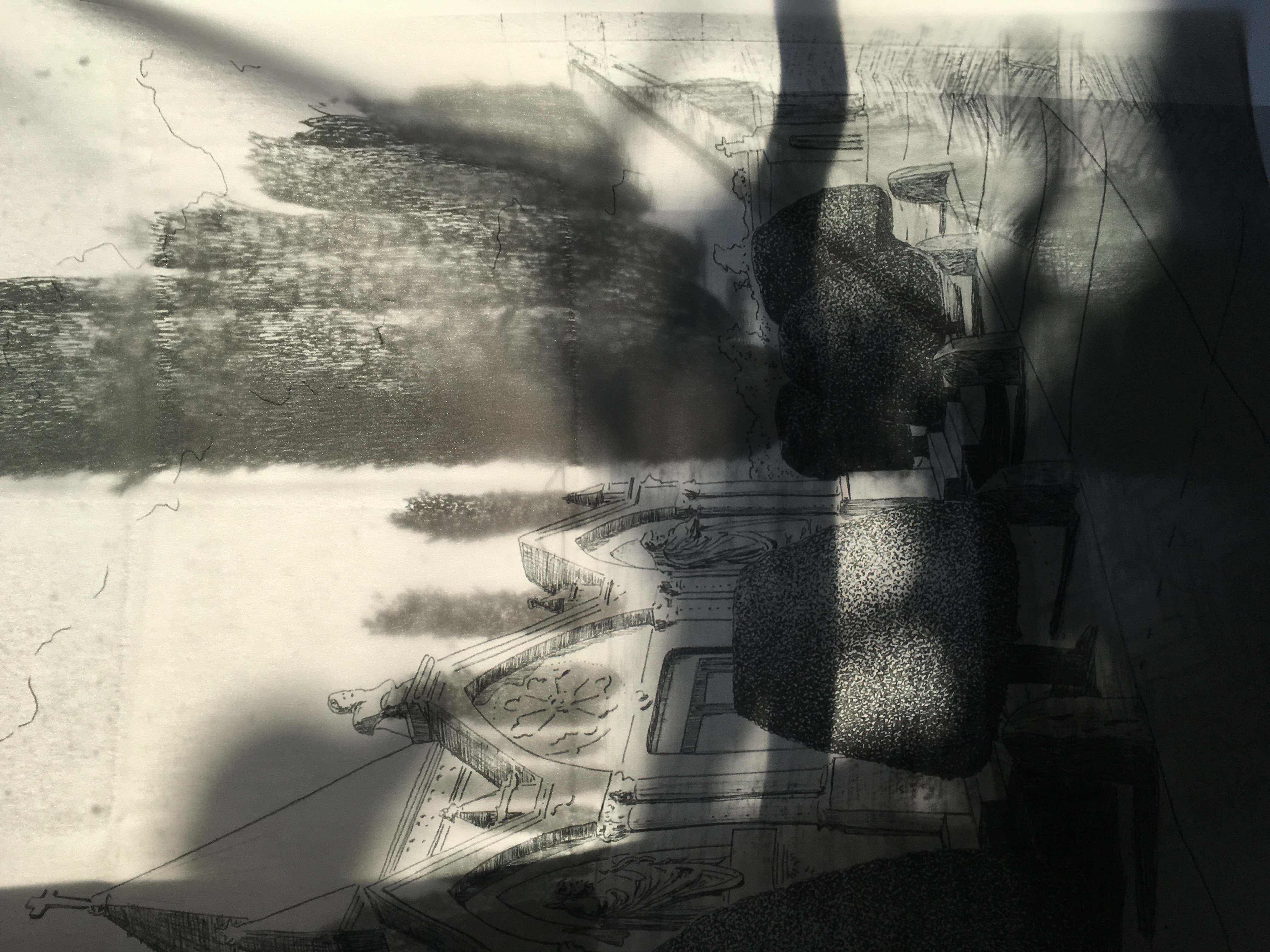 Ongoing development of analytical drawings as textiles, exploring light and unexpected juxtapositions: an attempt at film editing using drawings, fabric and light.